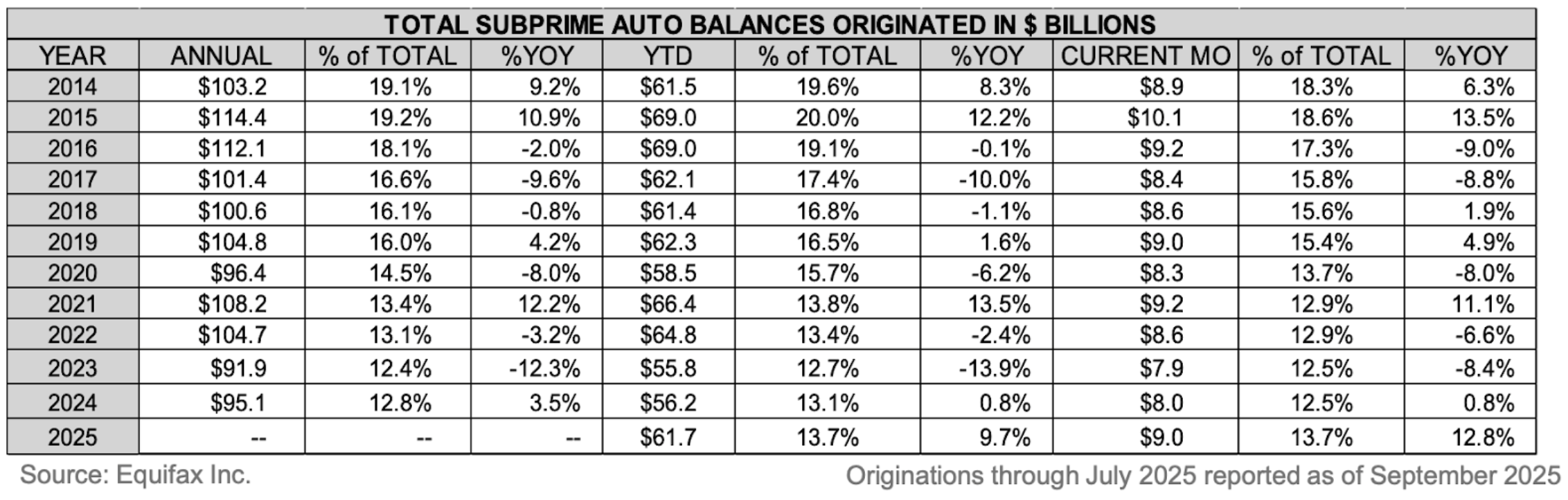 In dollar terms, total US subprime auto originations (defined by credit scores less than 620) have amounted to approximately $100 billion per year for the past decade.