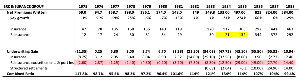 Markel’s reinsurance struggles led us to explore how Berkshire scaled its reinsurance business in the early days. Berkshire lost a ton of money writing reinsurance through the 70s and 80s.